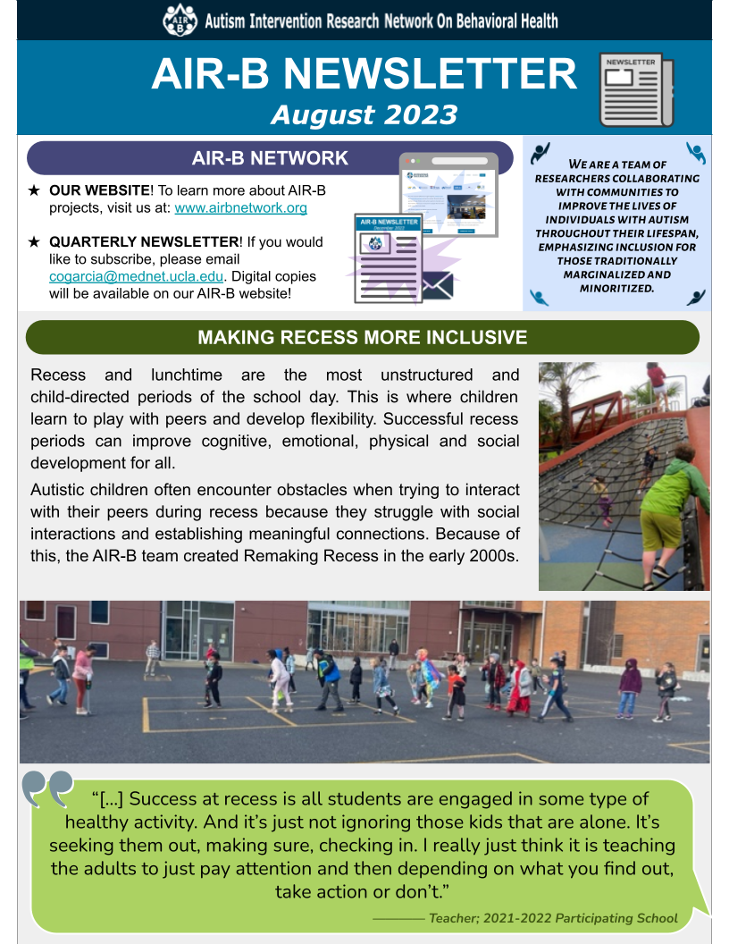UCLA established a partnership with Leo Politi Elementary School in the Los Angeles Unified School District (LAUSD). This partnership allowed AIR-B staff from all sites to train for the Remaking Recess intervention as well as the STAT intervention. AIR-B staff helped teachers and paraprofessionals implement interventions to improve the social engagement of their students.